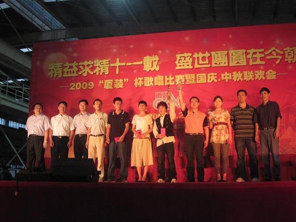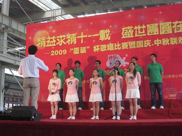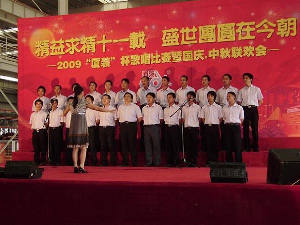 9月29日下午,2009年度“廈裝杯”歌唱比賽在廈裝公司總裝車間舉行。此次歌唱比賽以“精益求精十一載、盛世團圓在今朝”為主題,賀祖國60周年華誕、喜迎中秋、慶祝廈裝成立11周年。公司及各部門從6月份開始籌備此次比賽,此次比賽分為集體組和個人組,集體組(合唱)以部門為單位,最終有6支隊進入當天的決賽,個人組通過先前的部門推薦及預(yù)賽選拔,最終有11人闖入決賽。